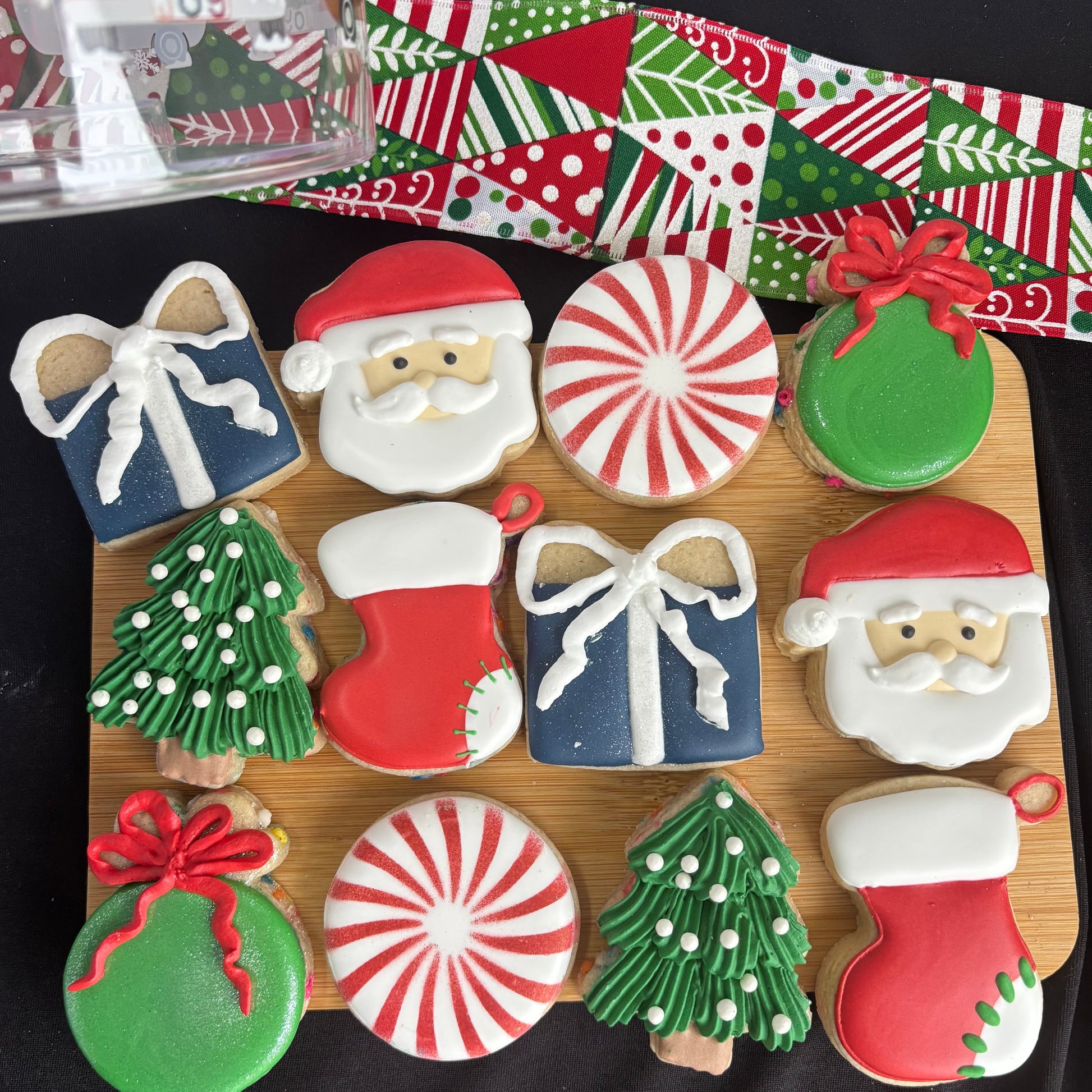 TWELVE - 2 inch sugar cookies , individually heat sealed in cellophane bags, placed inside a Holiday container, topped with a holiday bow and tag